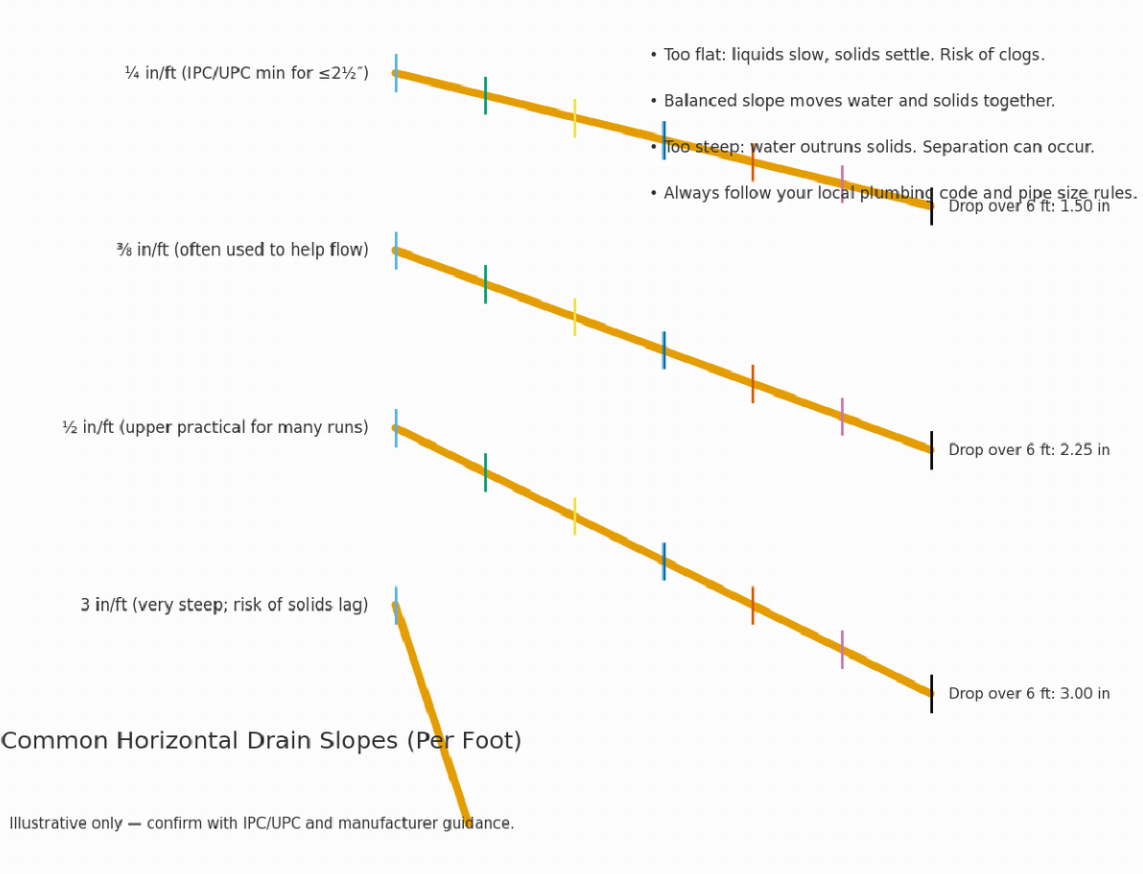 Drain Slope: 1/4 or 3/8 In/ft? Real Answers (plumbing101.i234.me) Question I read many opinions on the drain slope for nearly level runs. Some cap the slope at 1/2 inch per foot. Others allow 3 inches. Many say 1/4 inch per foot is ideal for most cases. I even considered field tests with sagged pipes and… Continue reading Drain Slope: 1/4 or 3/8 In/ft? Real Answers