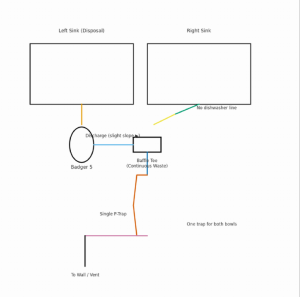 I am installing an InSinkErator Badger 5 (1/2 hp) under a double sink. There is no dishwasher. The disposal outlet lines up with the horizontal pipe that feeds a tee, then a single P-trap, then the wall drain. The manual mentions two traps. The disposal also features a 90-degree discharge tube that directs the flow downward. I want to avoid major rework. Can I keep everything horizontal and avoid vertical changes? Are there basic double-sink disposal layouts? Drawings would help.